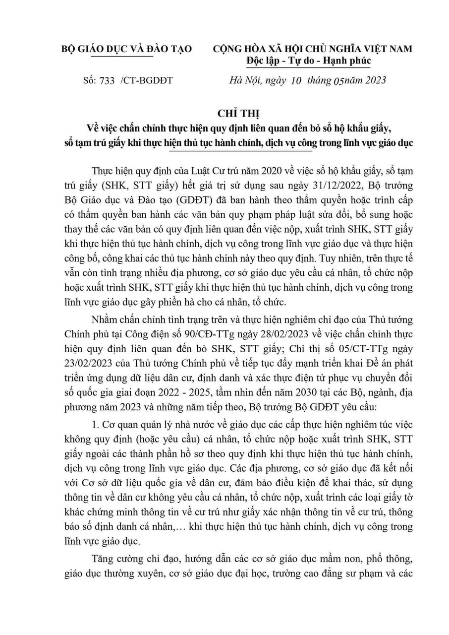 Ngày ban hành: 14/5/2023Số/Ký hiệu: Số: 733/CT-BGDĐT